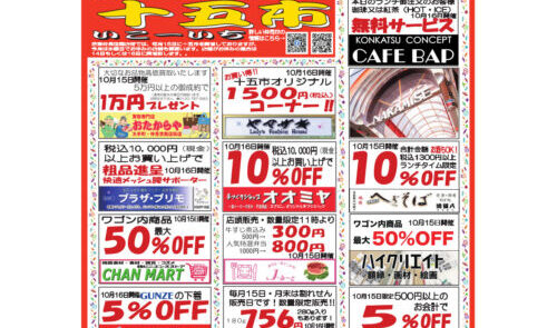 10月15日、16日は十五市の開催日です。 今月は15日がお休みの店舗の多い水曜日の為、15日、16日での開催となります。 宜しければ2日間続けて来て下さいね! ……
